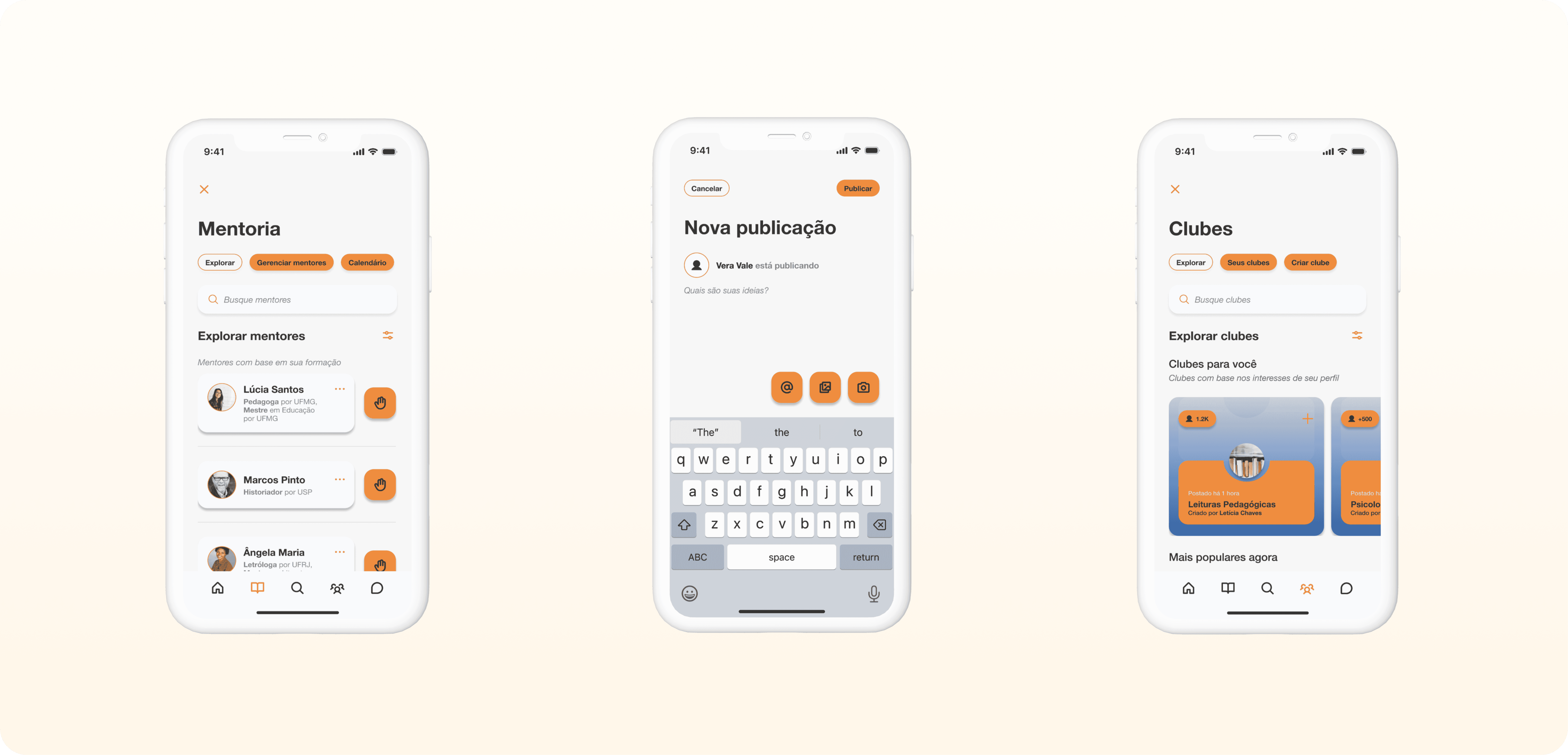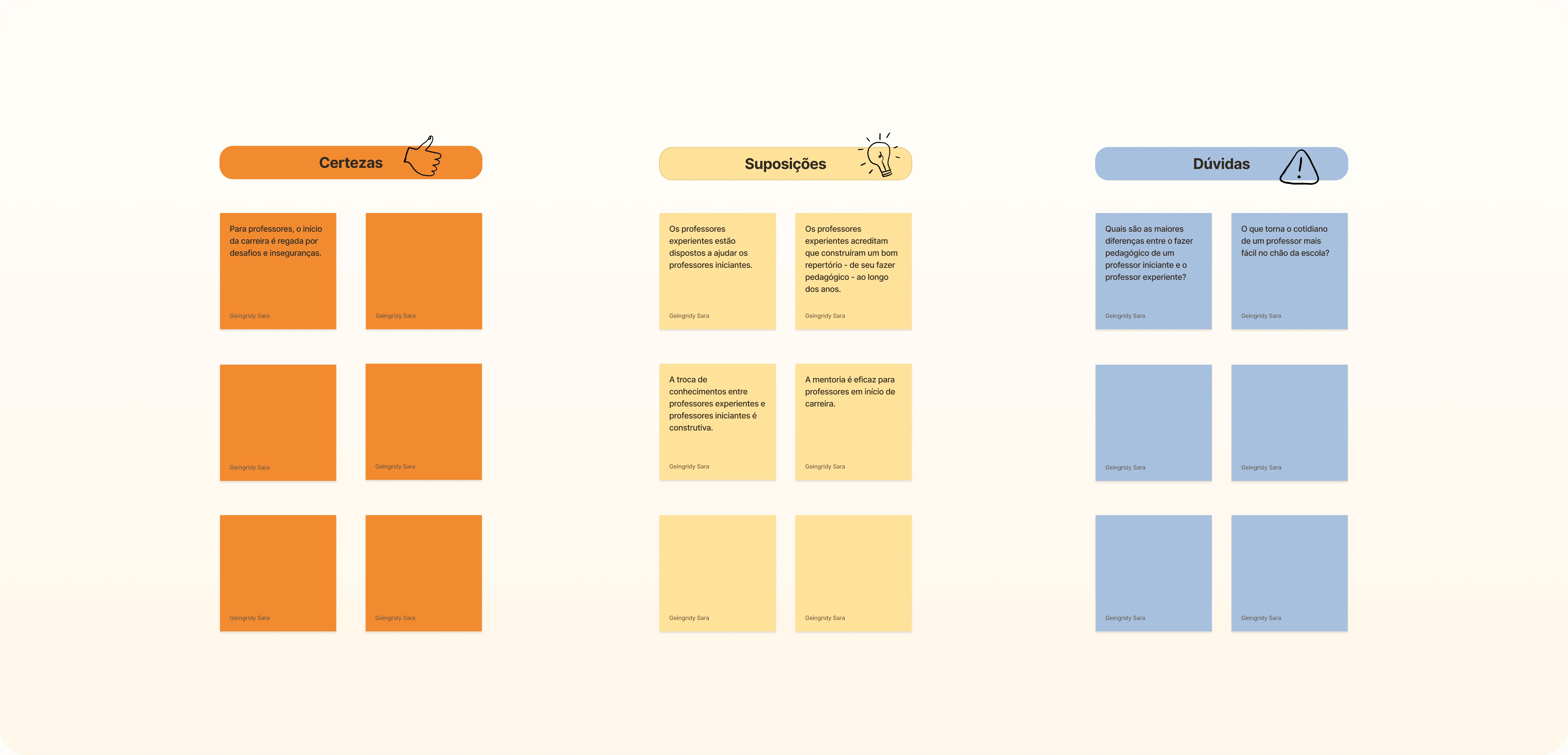 Brainstorming: Com os dados obtidos, foi possível identificar os principais pain points e definir direcionadores claros para as soluções — atestando que o desenvolvimento da interface estivesse alinhado às necessidades concretas dos usuários. Seguindo essa linha de raciocínio, foi estabelecido que o Edu Connect deveria promover conexão entre professores iniciantes e professores experientes, oferecer suporte prático e criar um ambiente seguro para a troca de conhecimento.