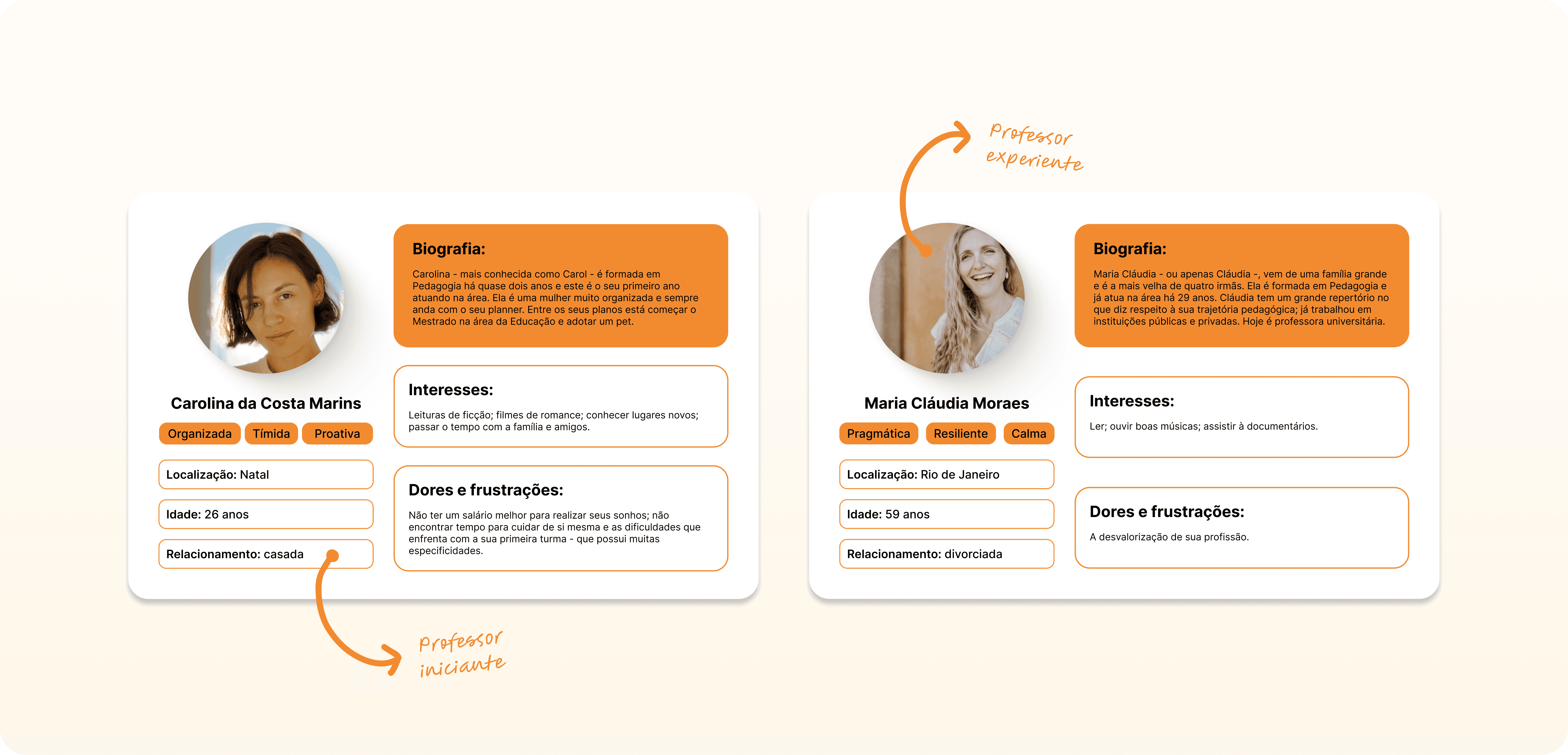 Personas: Foram desenvolvidas duas personas que sintetizam padrões comportamentais, necessidades e desafios identificados ao longo das pesquisas. Uma para o professor iniciante e uma para o professor experiente. As personas combinam dados reais e fictícios, tornando os perfis mais tangíveis e capazes de guiar as decisões em prol do design.