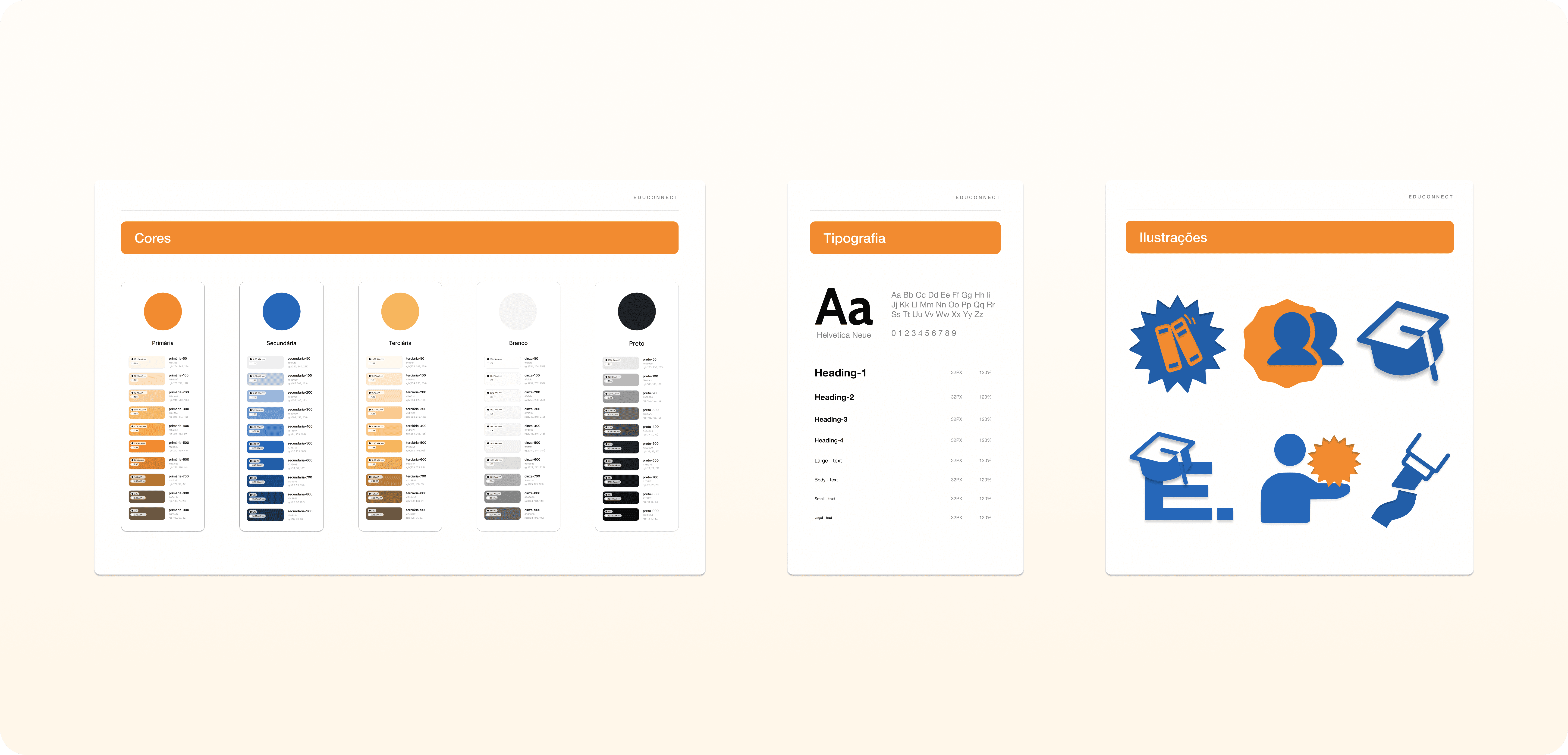 Styleguide: Antes de avançar para o protótipo de alta fidelidade, defini os fundamentos visuais da interface: paleta de cores, escala tipográfica, linguagem de ilustrações e grid. Esses elementos estabeleceram a base do sistema visual, garantindo consistência, hierarquia e clareza na comunicação. À medida que a interface evoluía, novos componentes foram adicionados, mantendo a coerência e fortalecendo a identidade do Edu Connect.