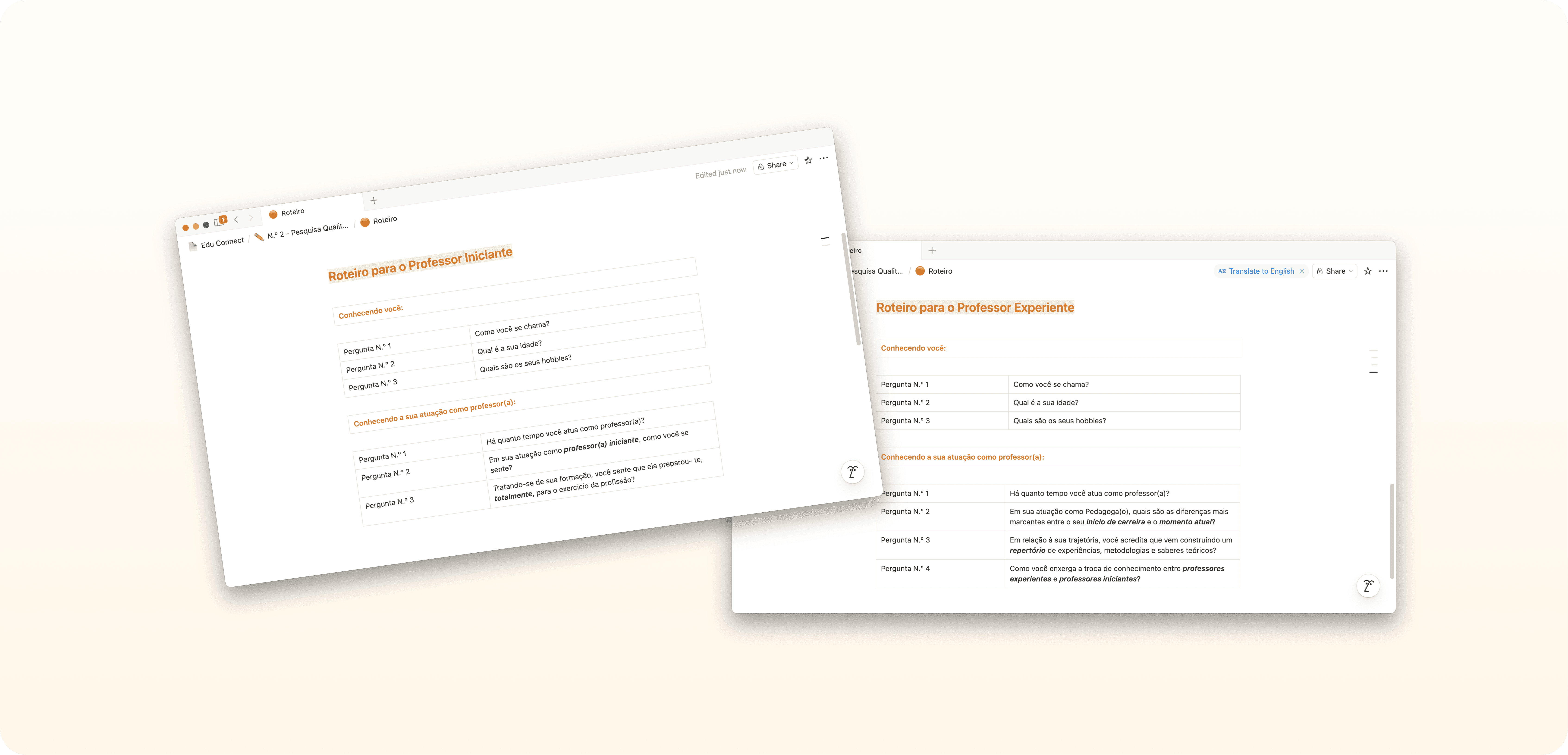 Pesquisa Qualitativa com Usuários: Conduzi uma pesquisa qualitativa com 10 professores — cinco iniciantes e cinco experientes — por meio de formulários estruturados. A segmentação entre diferentes momentos da carreira permitiu comparar perspectivas e identificar padrões recorrentes, convergências e lacunas específicas da trajetória docente. Os relatos revelaram: insegurança na tomada de decisões pedagógicas; sentimento recorrente de desgaste e necessidade de troca entre pares. Essas evidências confirmaram as suposições iniciais e direcionaram o Edu Connect como uma solução centrada na conexão entre professores, no suporte prático e no fortalecimento da confiança profissional ao longo da carreira.